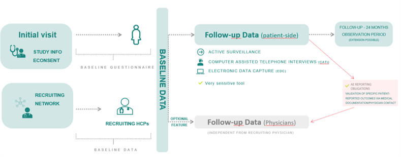 The ZEG Berlin European Active Surveillance/International Active Surveillance (EURAS/INAS) study design has been used extensively in Post-authorization safety studies (PASS) since 2000. By asking participants directly about their experiences with the study medication, we can gather data highly sensitive to the outcome of interest. All outcomes of interest are then validated by the treating physician to ensure that data is robust and specific to your needs. We are also able to include questions at both baseline and follow-up to elucidate important co-variables not easily sourced from electronic databases and registry data (e.g. mood, pain, and breastfeeding).